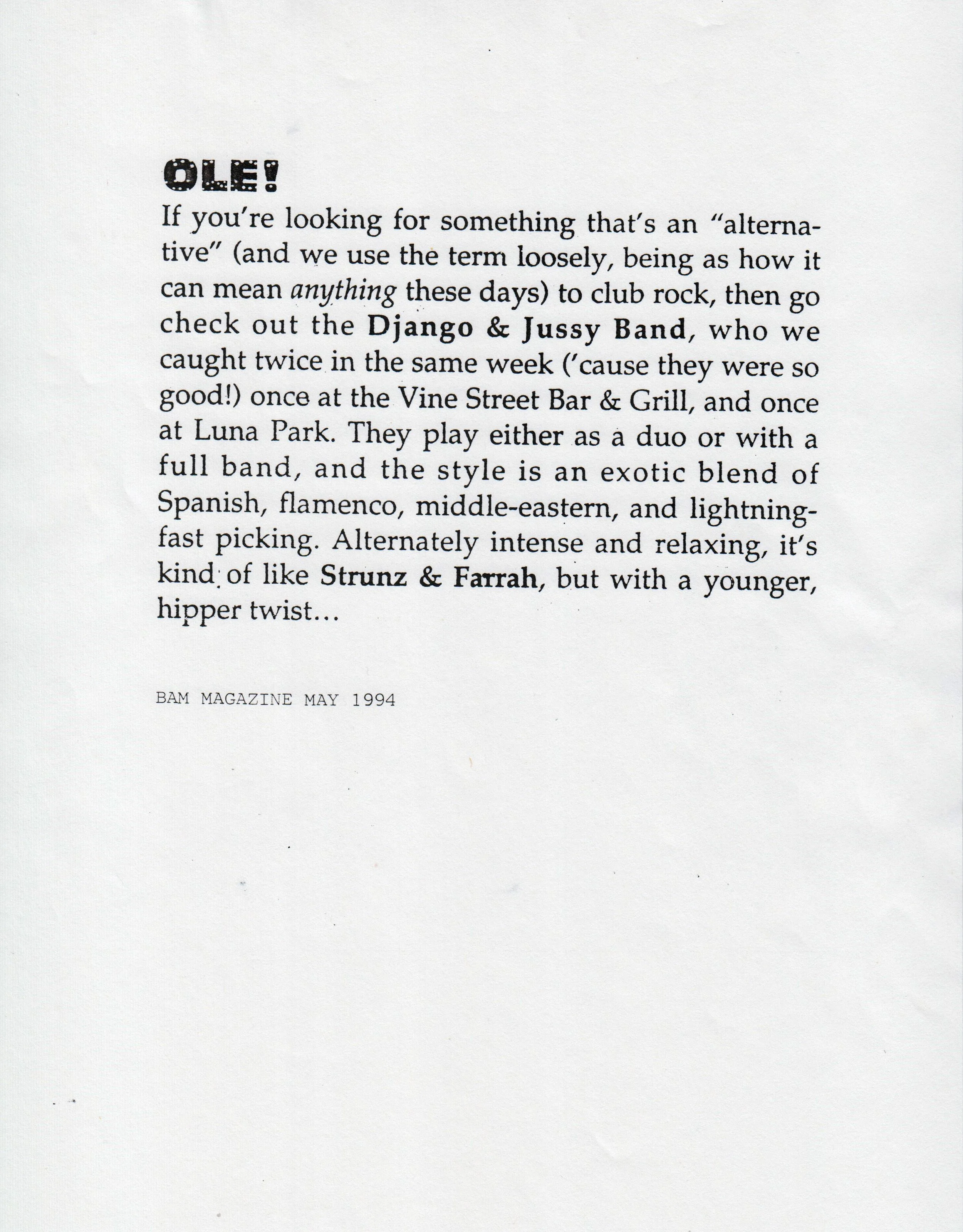 Yussi & Django perform extensively around the Los Angeles area. They both play in many other situations; Yussi with the critically acclaimed X DOT 25 group "Axiom of Choice", Ricky Martin (formerly of Menudo and currently appearing on General Hospital) who"s CD has recently been at #1 on the Latin/Pop charts , and many famous Middle Eastern singers; and Django with the famous Persian singer "Andy", with Big Mountain (who's remake of Peter Frampton's "Baby I Love Your Way" was a hit) as well as belly dancers, flamenco dancers, and rock acts. They have recently performed live on local (Fresh and Fun) and national (t.v.) cable TV. Both played on the nationally charted CD "Storyteller" by percussionist/singer Vinx (who has toured with Sting).